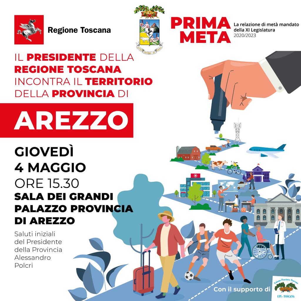 La quarta tappa del tour del presidente della Regione Eugenio Giani nelle province toscane sarà ad Arezzo e sarà focalizzata sul territorio della Provincia aretina. Il tour “Prima meta” è l’occasione per fare il punto su quanto realizzato dall’amministrazione regionale nei primi due anni e mezzo di legislatura.
