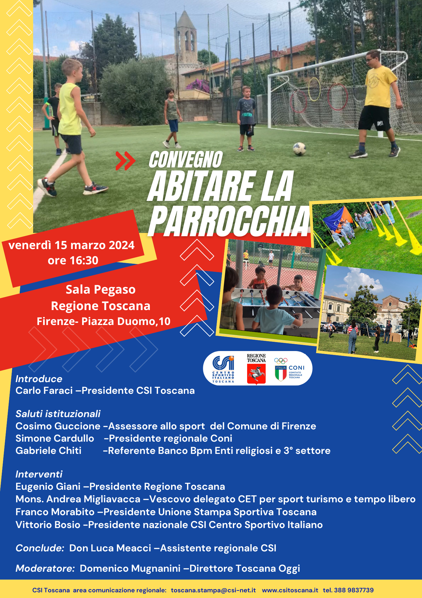 Si parlerà di sport e tempo libero al convegno “Abitare la parrocchia” che si svolgerà domani, venerdì 15 marzo, a partuire dalle 16.30, nella sala Pegaso di Palazzo Strozzi Sacrati e organizzato dal Centro sportivo italiano in collaborazione con Coni e Regione Toscana.