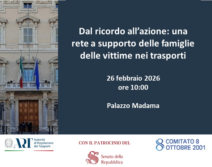 Giovedì 26 febbraio, alle ore 10:00, presso la Sala Koch del Senato della Repubblica, si terrà l’evento “Dal ricordo all’azione: una rete a supporto delle famiglie delle vittime nei trasporti”, organizzato dall’Autorità di regolazione dei trasporti con il patrocinio del Senato della Repubblica e in collaborazione con il Comitato “8 ottobre 2001”.